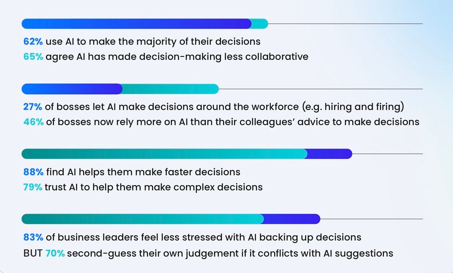 The survey boasts a staggering 62% of executives are using AI to make a majority of their decisions, including 27% for deeply human calls like hiring and firing. Now, before panicking, it’s worth acknowledging that “using” isn’t clearly defined and means a lot of different things to different people. It doesn’t necessarily mean they’re hiring and terminating employees autonomously, although that is happening. However, it exposes a rising behavioral trend we cannot ignore. Under the crushing weight of modern leadership, more and more are tempted to offload cognitive burdens to a bot. Pair that temptation with the statistics on executive regret, and the picture gets dark quickly.